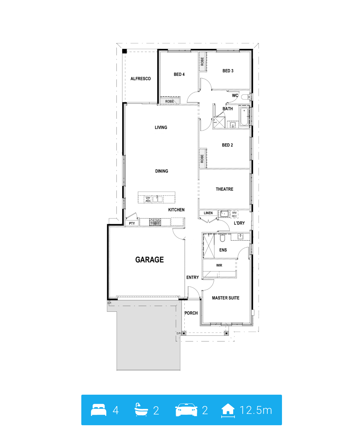 This home design is Radical Bro! As great as the name is, The RAD is no joke! This plan packs a punch with a spacious front located Master suite, complete with ensuite and walk in robe. A centrally located open entertaining area including your Kitchen (fit for a chef), dining area and your living (or lounging) area! Last but not least, you have your spare rooms, which can transform into guest rooms, kids bedrooms or even a home office!