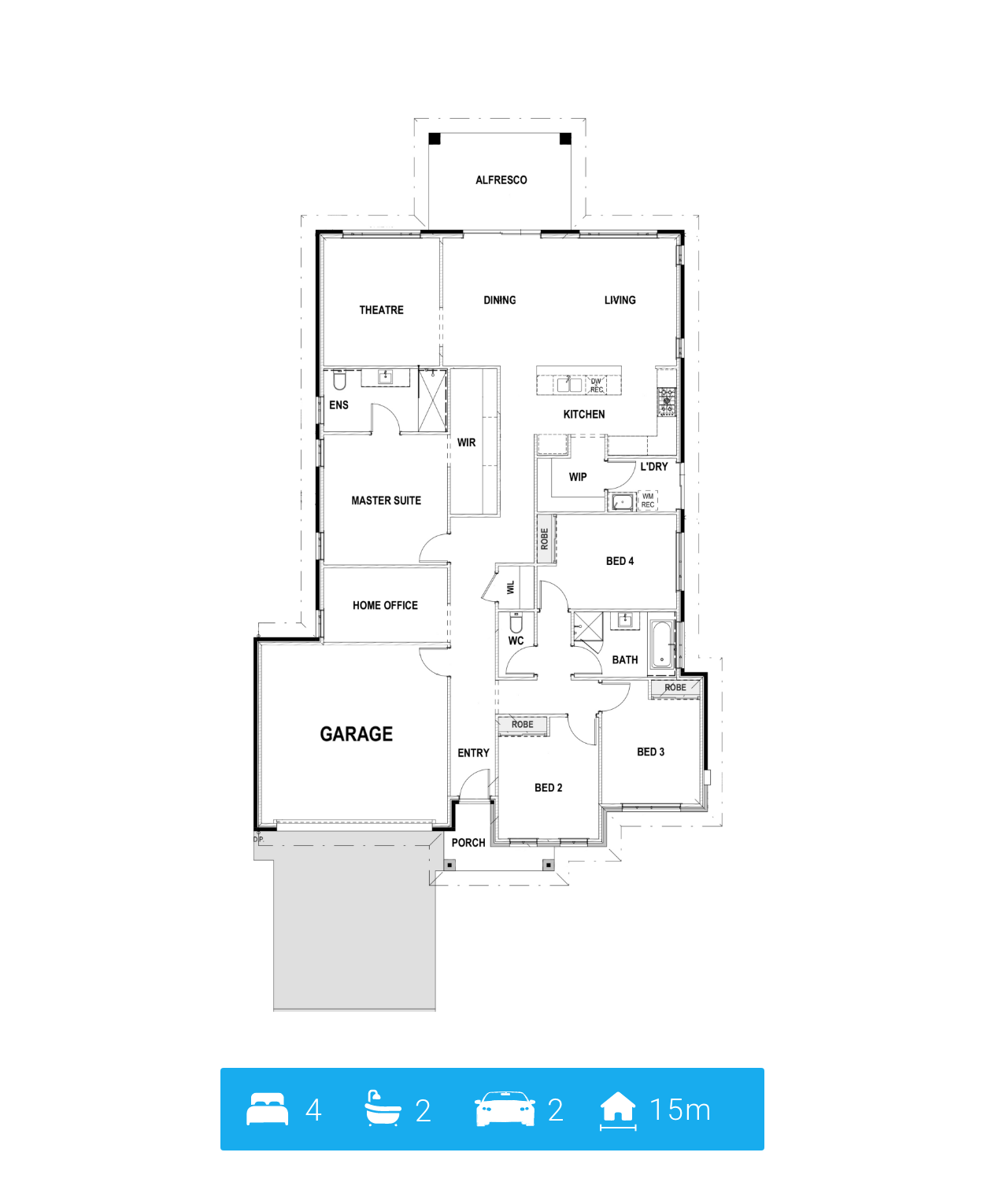 What makes a home design remarkable? Lets run through The REMARKABLE and you can see for yourself! Entering your home, you are met with your spare bedrooms. Weather it’s kid’s rooms or Guest bedrooms; that’s completely up to you! Guess what? Want a home office? You don’t have to sacrifice one of your spare rooms, as The REMARKABLE has its own home office built in! Heading further in you have your Master suite, with an ensuite and a huge walk-in robe. Next up is your future entertaining spaces, with your kitchen, living and dining room, big theatre room and an outdoor entertaining space with an alfresco! Remarkable right?