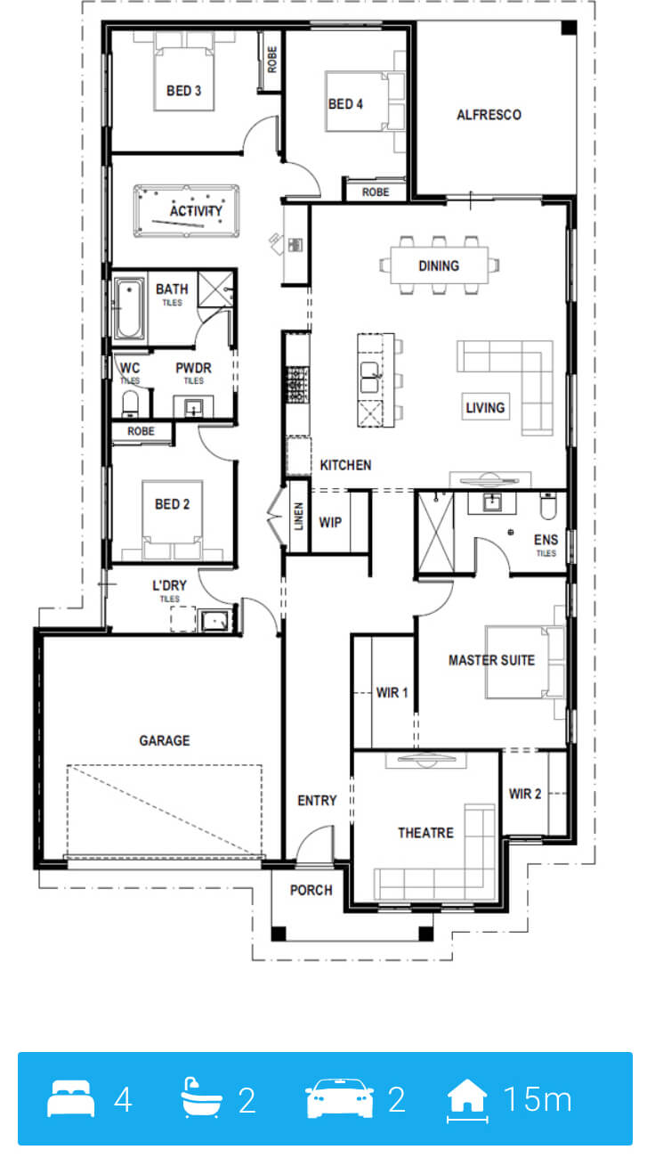 “THE SLAPS’ is an SA exclusive, which is visually unique! Located at the front of the house is a large Theatre Room which will be fantastic for binge watching the next Netflix hit series, or for hosting a movie marathon. Next is where this is design is a little different, the large Master Suite wraps around the Theatre, which provides some interesting layout opportunities! Attached is an Ensuite and Walk in robe. The rest of your house can be divided into two areas, on the left, you have everything that you need to entertain and host the best catchup dinners, including the outside Alfresco area. On the right, you have 3 Guest Bedrooms, Laundry, and an Activity area. You are on the market for a quirky modern house? Well, I can tell you ‘THE SLAPS’ just slaps.